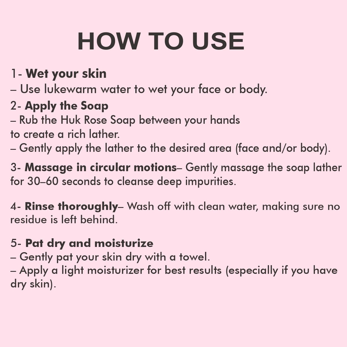 – Natural Ingredients: Crafted with natural, skin-loving ingredients, Huk Rose Soap is free from harsh chemicals, ensuring a gentle and safe cleanse for all skin types.